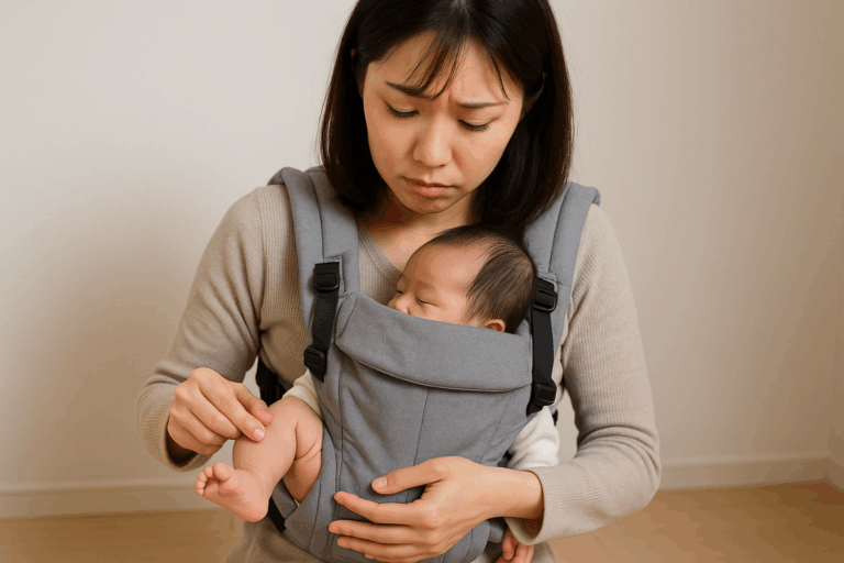 生後1ヶ月の赤ちゃんを抱っこ紐で抱いたとき、「足がうまく開かない」と感じるのは多くの親が経験する悩みのひとつです。