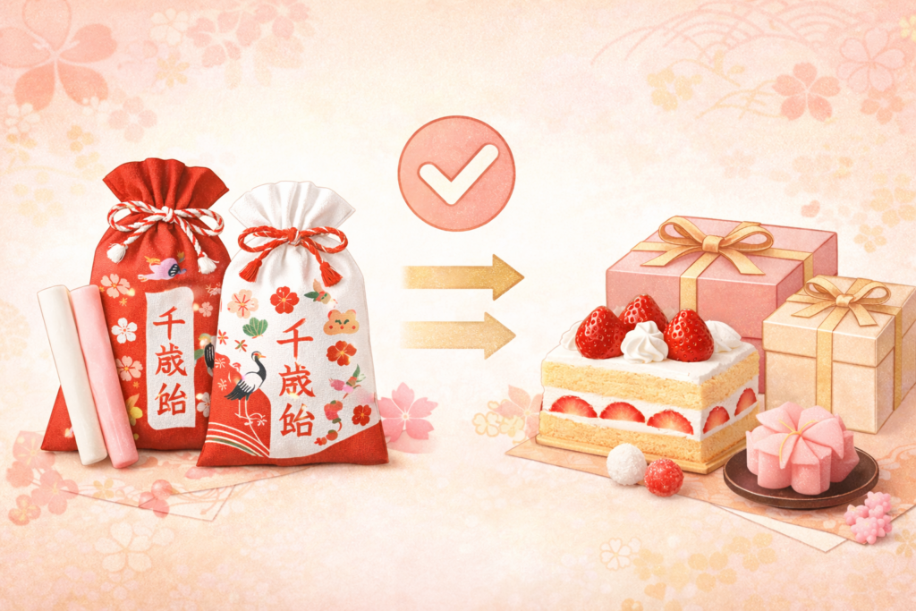 実際の準備では、「伝統アイテム」と「家族で楽しむお祝い菓子」を分けて考えると判断しやすくなります。千歳飴は縁起物として必要性が高く、神社や専門売場との相性が良い一方、ケーキや箱菓子は祝いの食卓や手土産向けとして選ぶのが基本です。