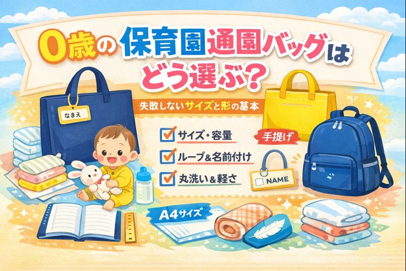 0歳の通園バッグは、赤ちゃんが背負う前提ではなく親が毎日持つ前提で選ぶと失敗しにくくなります。園指定のサイズや形、ループの有無、名前付けのしやすさを先に確認し、持ち物量と週末の持ち帰りも想定して容量を決めましょう。