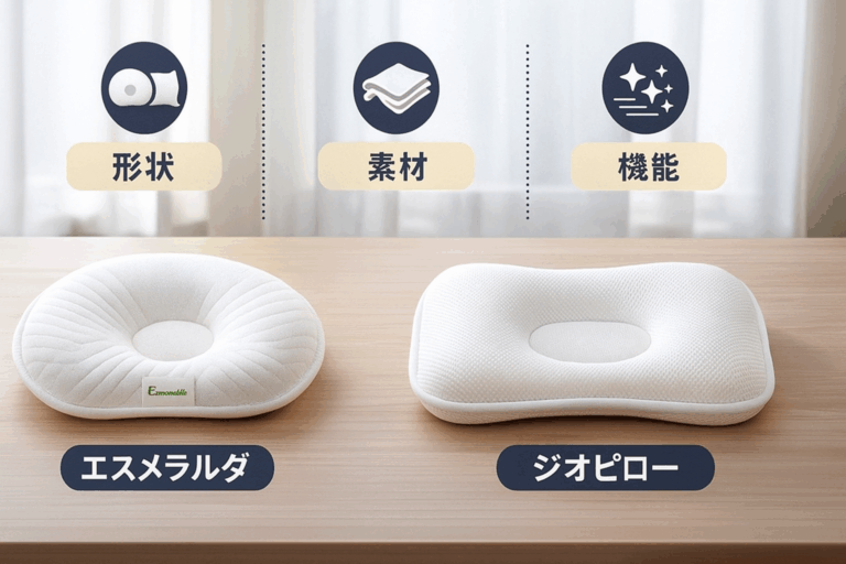 エスメラルダは普段使いの心地よさや扱いやすさがメリットで、日常の寝姿勢サポートに適している一方、ジオピローは左右差などが気になるときに短期間集中的に使うケースが多い印象です。