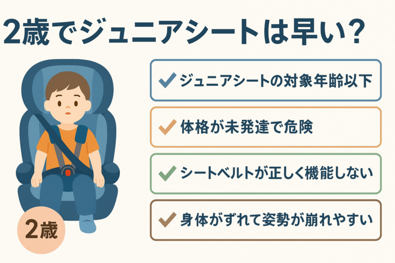 ジュニアシートは体格が一定基準に達していることが前提で、身体の発達が未熟な2歳児ではシートベルトが正しく機能しないリスクがあります。