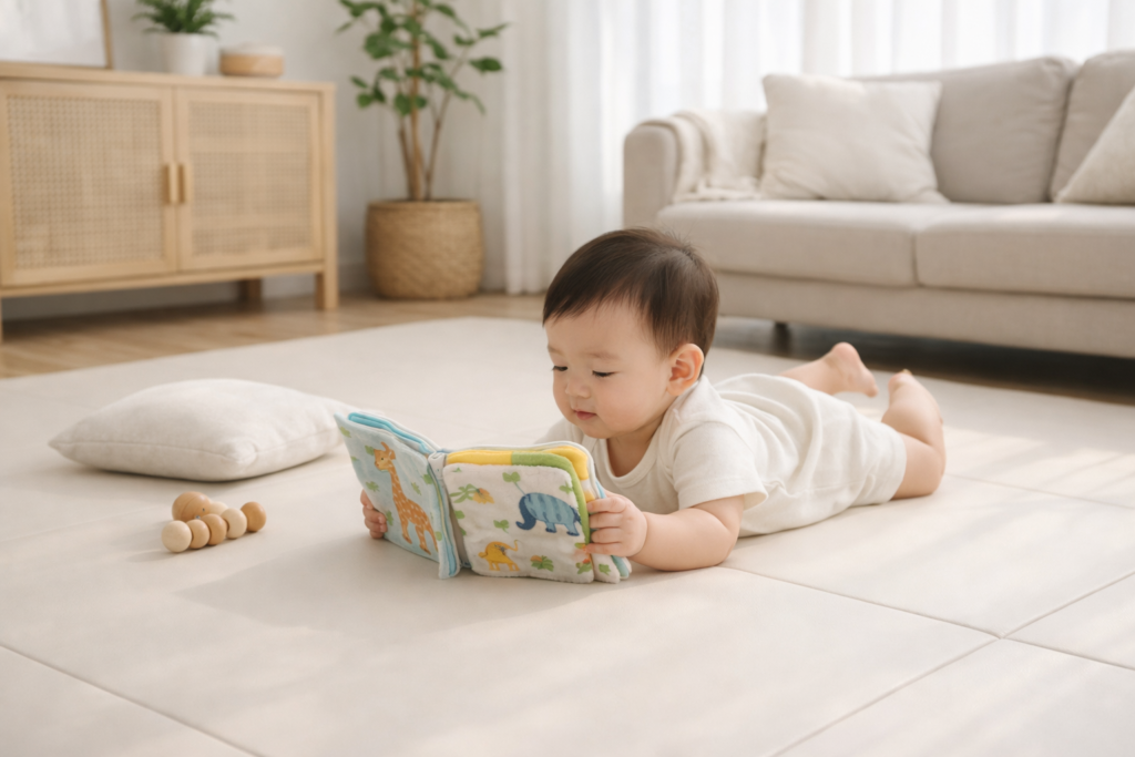 赤ちゃんが動き始めると、転倒の衝撃だけでなく、足音やおもちゃを落とした音も気になってきます。popomiのプレイマットは、厚みのあるタイプを選べば、床への衝撃をやわらげやすく、マンションや集合住宅の不安軽減につながります。