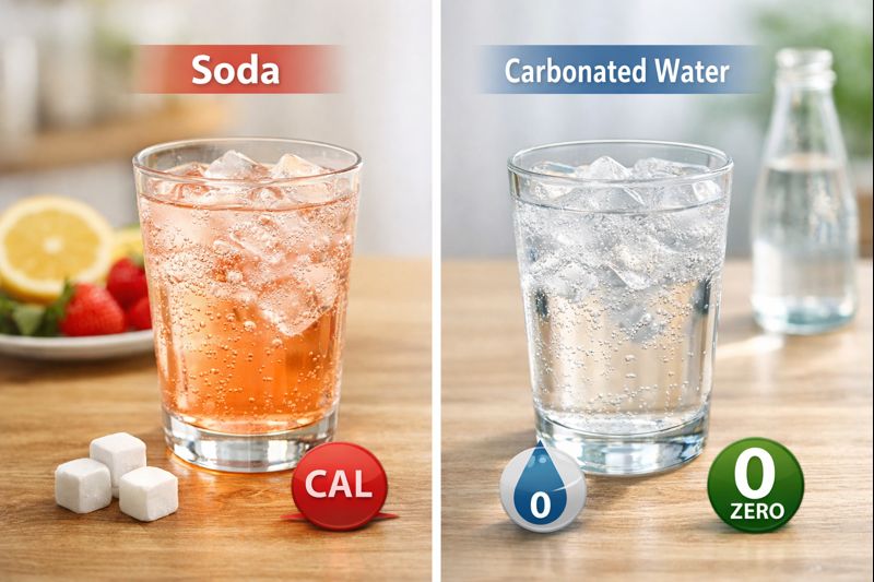 炭酸水は原則として砂糖や人工甘味料を含みません。そのためカロリーはほぼゼロです。一方、ソーダには砂糖や果糖ブドウ糖液糖、人工甘味料などが使われていることがあり、商品によっては糖質やカロリーが高くなります。