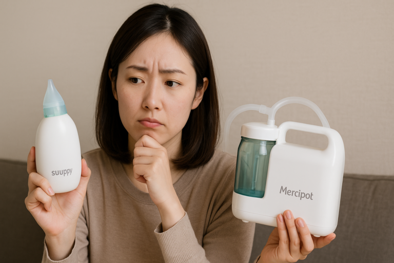 suupyとメルシーポットはどちらも家庭用として高い評価を得ていますが、ノズルの形状や吸引力の強さ、ケア中の赤ちゃんの負担の差など細かな違いがあります。