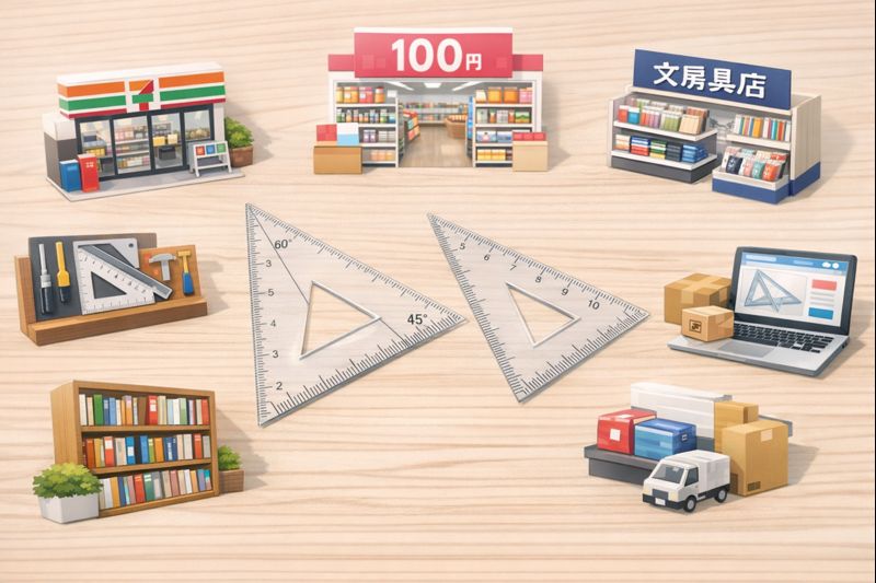 三角定規は、文房具店をはじめ、100均、ホームセンター、書店、スーパー、通販など、さまざまな場所で購入できます。ただし、どこに売ってるかは用途や緊急度によって最適な選択肢が変わります。